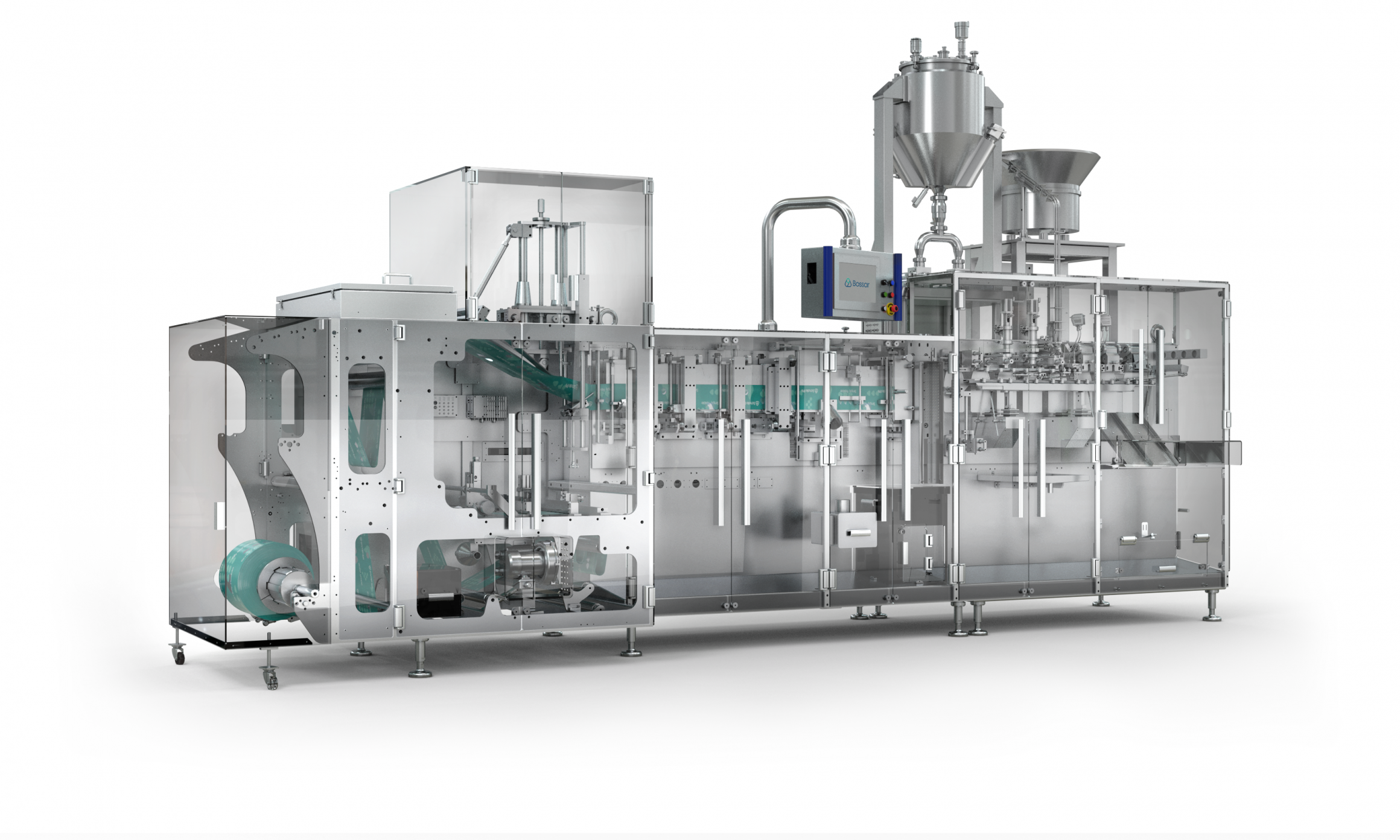 Bossar模型BMK 1400.在50 × 60毫米至140 × 230毫米范围内形成和填充袋。它可以达到每分钟200袋的产量,并装满750cc的产品。